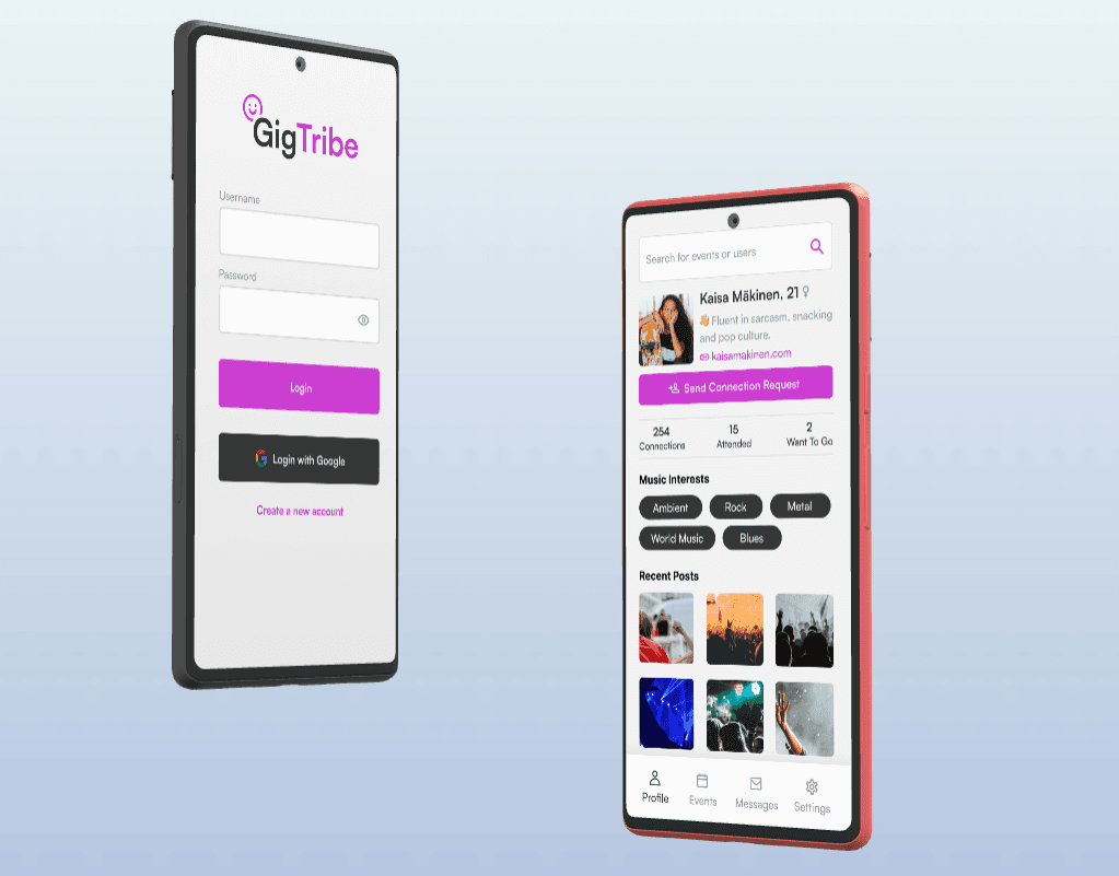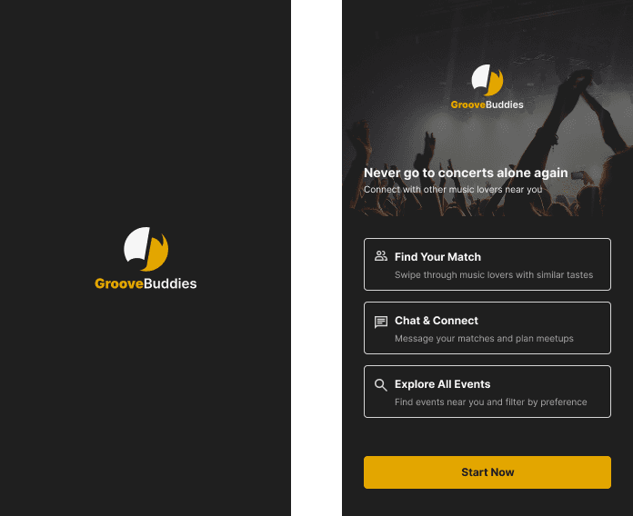 GrooveBuddies is an iOS app that connects people with similar music interests so they can attend concerts together. Designed to reduce the discomfort of going to events alone, the app focuses on discovery, matching, and easy planning.
