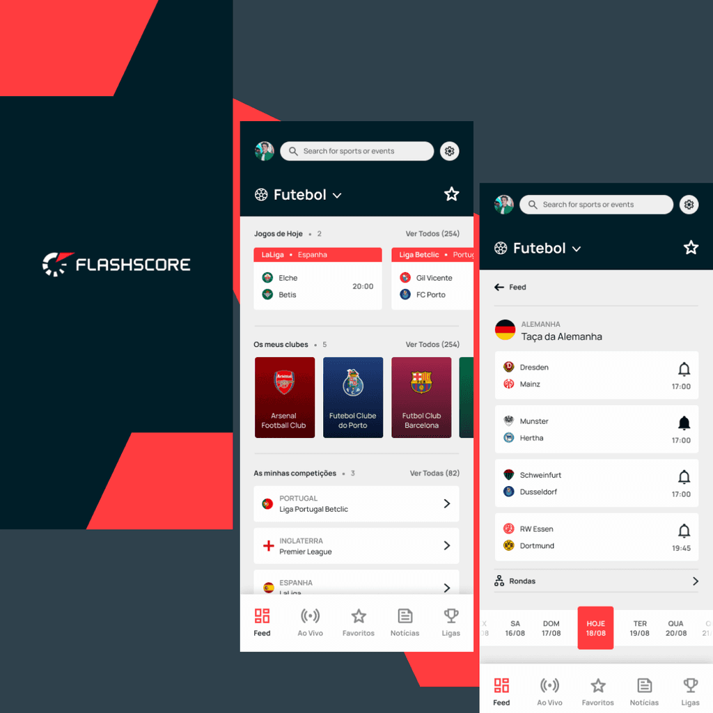 "Goals, scores, and stories, all on Flashscore. Follow all the latest highlights across the world of sport" - proposal of redesign of the Sports app, aiming to improve usability and readability overall, modernizing the visuals without losing its core focus and identity.
